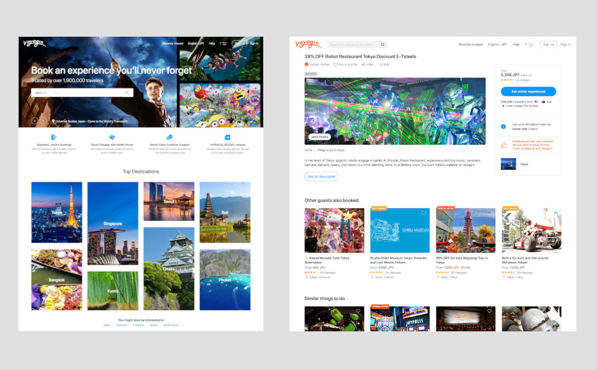 At Voyagin, a Tokyo-based travel agency and tours and ticket booking platform, I worked as a Full-Stack Engineer using React and Rails.